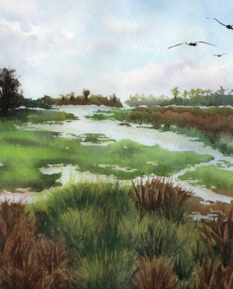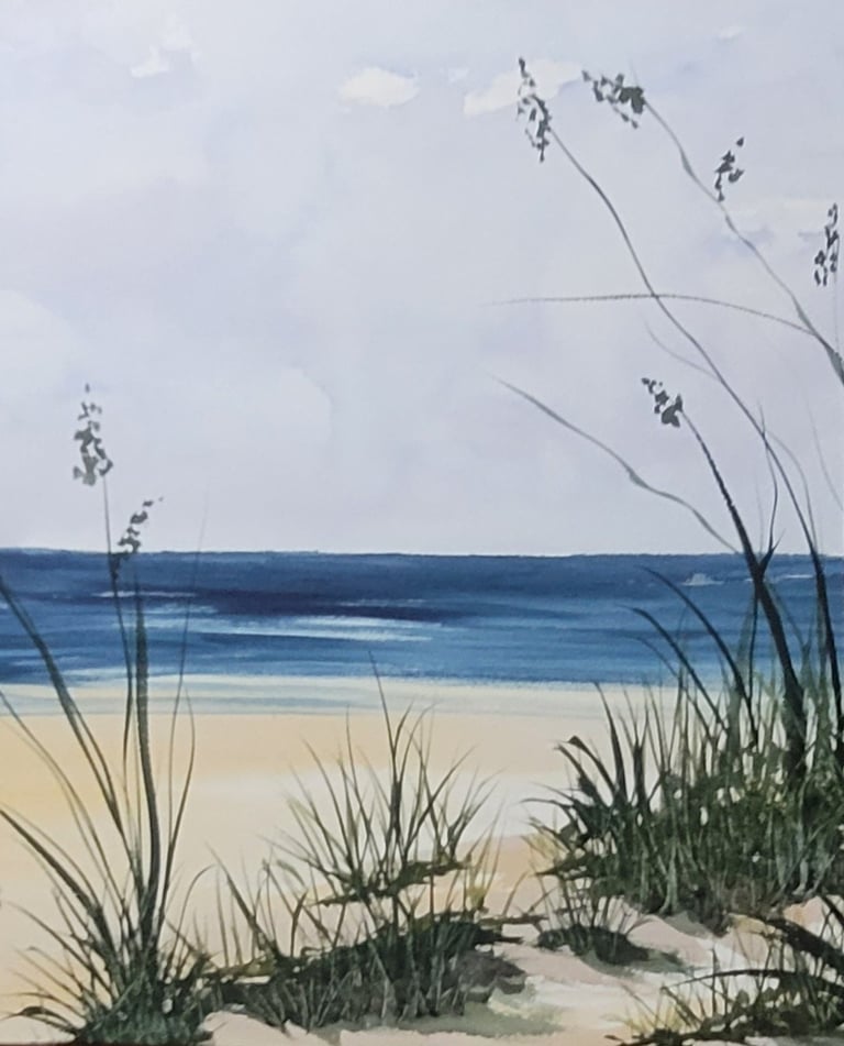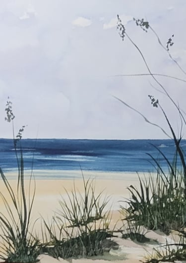 Sunrise to sunset, soft sand and gentle birds captured in watercolor.